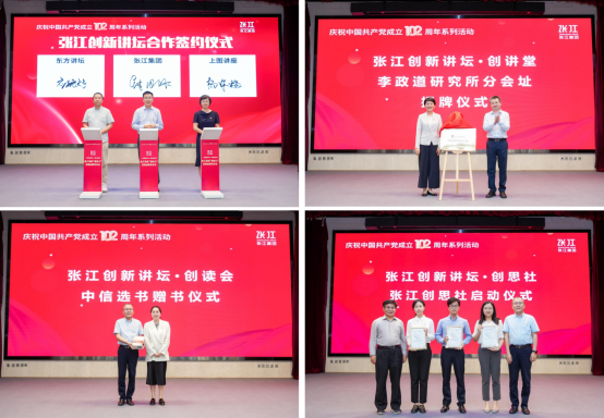 張江創新講壇合作簽約儀式(左上)、李政道研究所分會址揭牌(右上)、中信選書贈書儀式(左下)、張江創思社啟動儀式(右下)