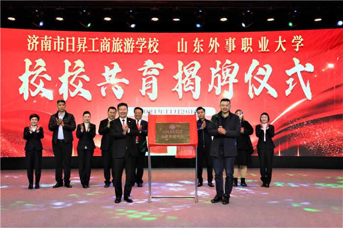 濟南市日昇工商旅游學校黨支部書記楊楠與山東外事職業大學副校長孫彤宇共同為山東外事職業大學“合作共建單位”揭牌。