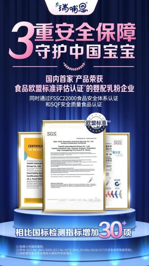 作為乳業領軍企業,雅士利國際的質量文化建設一直走在行業前沿,也由此獲得業內多項認可,榮獲國際權威認證機構SGS授予的嬰幼兒配方食品歐盟標準評估認證的產品認證證書,成為國內首家產品榮獲食品歐盟標準評估認證的嬰配粉乳粉企業,同時還獲得FSSC22000食品安全體系認證和SQF食品安全質量認證。