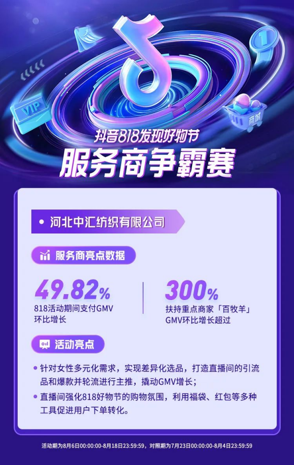 河北中匯紡織有限公司在其所服務的女裝直播間,深挖女性消費個性需求,選出小眾的產品,打造兼具引流品和爆品的貨盤;與此同時,渲染818氛圍,利用多種玩法(如福袋、紅包等),結合主播引導,促進粉絲下單。活動期,支付GMV環比增長49.82%。
