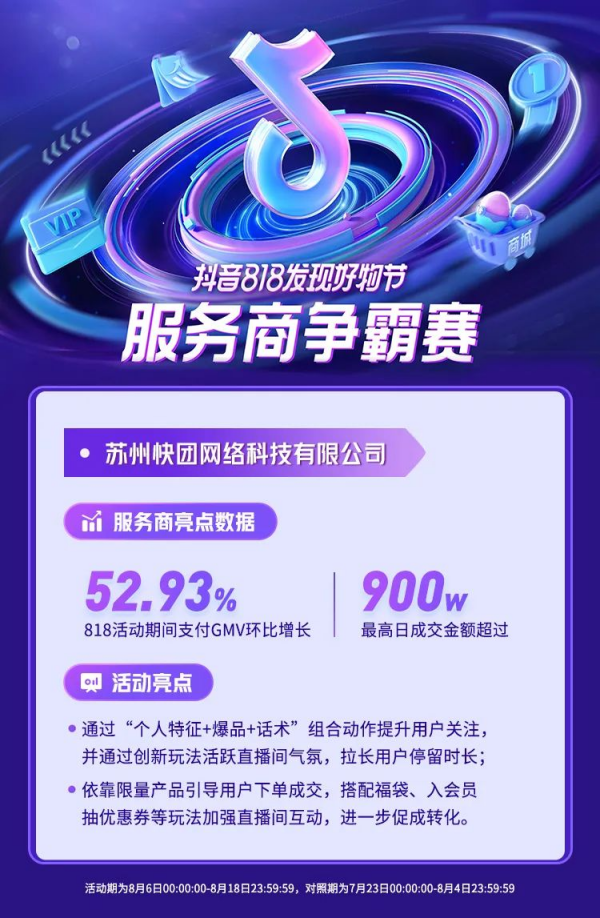 在直播間,蘇州快團網絡科技有限公司,利用人設特質配合爆品、話術,引導消費者在評論區扣彈幕,提升互動率;同時,依靠關注和燈牌,提升直播間的自然流量;通過優質限量產品,引導用戶下單成交;進而,搭配福袋、入會員抽優惠券等玩法加強直播間互動,促成下單。8月活動中,服務商家的結算GMV環比增長52.93%。