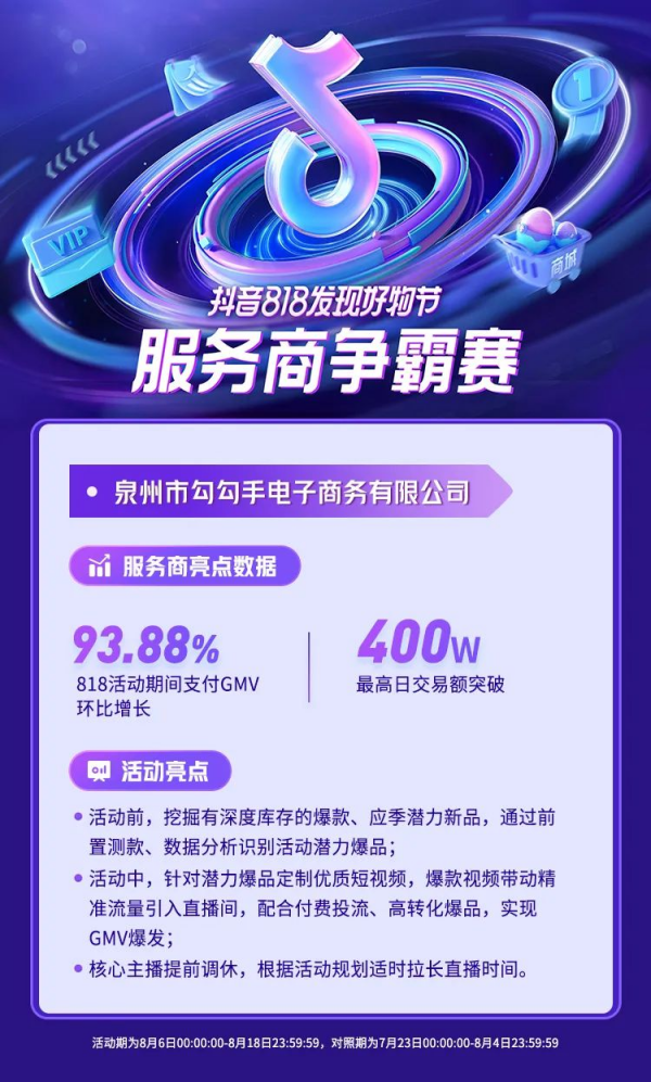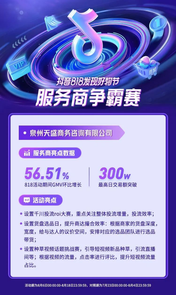 8月6日-8月18日期間,抖音電商服務商團隊面向入駐服務市場且綁定了合作店鋪的服務商,發起抖音818服務商賽道活動。抖音電商服務商團隊以潛力新星直播間、服務商任務賽、服務商排位賽等玩法,助推服務商帶動商家實現高效增長。