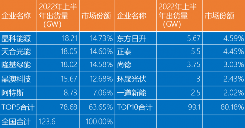 據(jù)PVInfoLink統(tǒng)計,今年上半年晶硅電池總產(chǎn)量約135.5GW。TOP5的通威股份、愛旭股份、潤陽股份、中潤光能、捷泰科技,總出貨量約59GW,占43.54%。另有投研機(jī)構(gòu)統(tǒng)計,TOP5出貨中,通威出貨約為22.5GW、愛旭出貨約為17GW、潤陽出貨約為13GW、中宇出貨約為5GW,捷泰出貨約為3GW。
