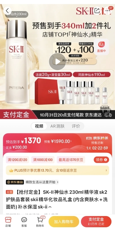 享譽全球的SK-II鎮店王牌神仙水,是每個精致女孩化妝臺上的必備好物。其蘊含超過90%的天然生物成分PITERA?,從根源強韌修護,顯著減少秋冬肌膚干燥泛紅,抑制老化因子,讓肌膚更加細膩緊致、晶瑩剔透。京東11.11期間,原價1590元的SK-II神仙水230ml裝到手價1370元,同時加贈神仙水110ml、潔面20g、清瑩露30ml,為消費者打造全流程的精致護膚體驗。