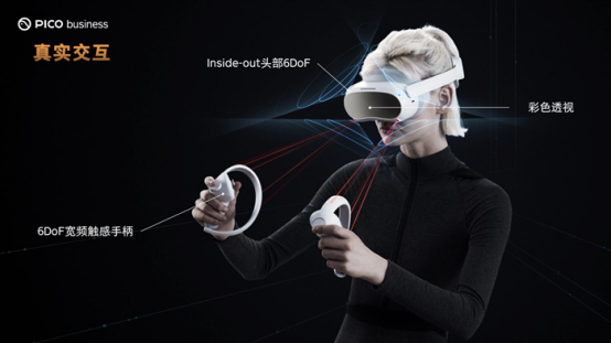 PICO 4 Enterprise憑借強(qiáng)大的真實交互能力,可以讓用戶能和周圍的環(huán)境產(chǎn)生真實的互動。它采用的6DoF空間定位配合6DoF寬頻觸感手柄,可實現(xiàn)亞毫米級定位精度和毫秒級追蹤速度,提供更加精準(zhǔn)、自由與沉浸的商業(yè)互動體驗。搭載的彩色透視功能讓用戶在佩戴VR一體機(jī)時也能夠查看外部實時環(huán)境情況,提高安全性。