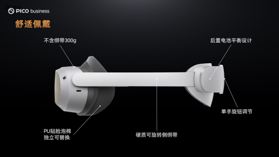 PICO 4 Enterprise采用一體化輕薄機(jī)身設(shè)計,符合人體工學(xué),久戴也舒適。機(jī)身不含綁帶僅重300g,只比一臺常規(guī)的智能手機(jī)重一點,采用后置電池平衡設(shè)計和硬質(zhì)可旋轉(zhuǎn)側(cè)綁帶,支持單手旋鈕調(diào)節(jié),大大優(yōu)化了用戶長時間佩戴的體驗。值得一提的是,PICO 4 Enterprise專為企業(yè)級用戶設(shè)計了獨立可替換的PU貼臉泡棉,相比布料的消費者版,更適合多人使用,滿足長時間佩戴的需求。