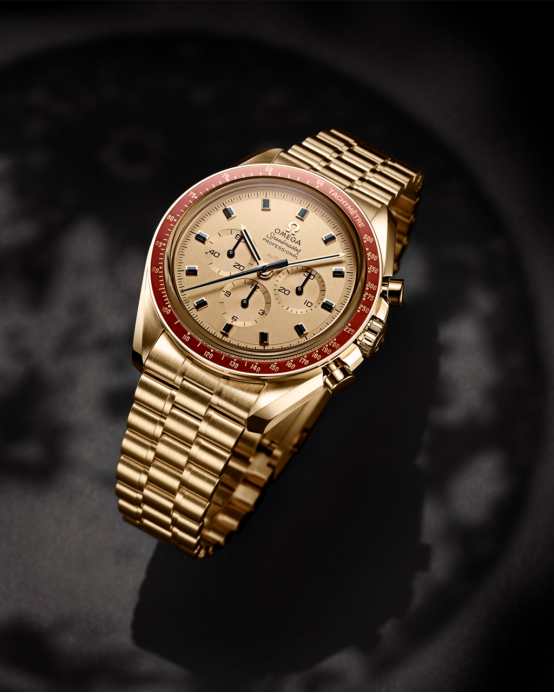 在1969這個重要年份里,除了隨宇航員登上月球的款式之外,還有一枚非常特殊的超霸表。在當年慶祝登月成功的晚宴上,歐米茄捧出了一款黃色18K金限量超霸腕表:金色表盤,勃艮第紅色鋁制表圈,鍍黑指針與時標,這是第一枚貴金屬超霸。