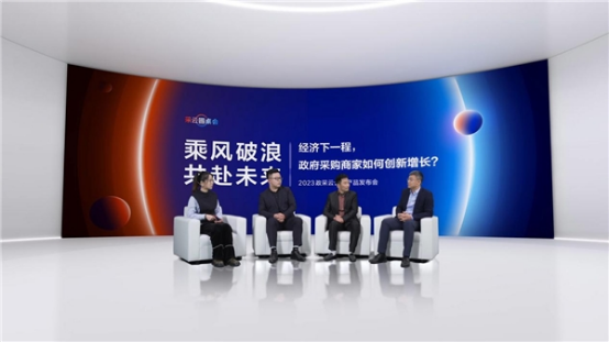 在政采云產品發布會“采云圓桌會”上,來自聯想集團中國區商用大客戶政采電商業務負責人宿博、浙江時代新銳科技有限公司董事長兼總經理王翔、杭州商廬貿易有限公司總經理歐邦海、政采云有限公司商家業務部總經理王銳敏共同探討了“經濟下一程,政府采購商家如何創新增長”的話題,各自分享了數字化轉型過程中的經驗。
