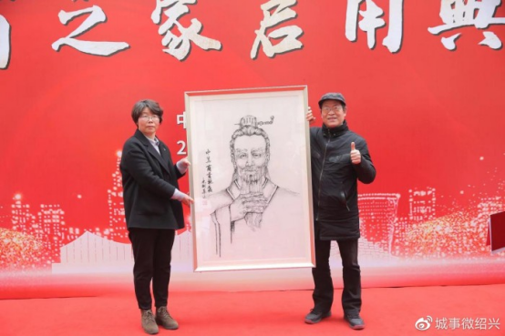儀式最后,紹興市知名藝術家林劍華先生向《越商之家》捐贈一幅精心創作的中華商圣范蠡肖像畫。