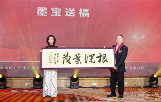 值此交接時(shí)刻,伍倩雯向第四屆會(huì)長(zhǎng)藍(lán)漢昌贈(zèng)出名家墨寶《根深葉茂》,向藍(lán)會(huì)長(zhǎng)八年來(lái)的無(wú)私奉獻(xiàn)、為酒協(xié)發(fā)展打下的深厚基礎(chǔ)致以深深的敬意和祝福。