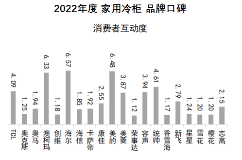 消費者互動度方面,海爾、美的、澳柯瑪位居前三。海爾、美的、澳柯瑪、統帥、容聲、美菱、新飛、康佳在近兩期中均位居前十。TCL、志高在本期晉升至前十,卡薩帝、奧馬則掉出前十。