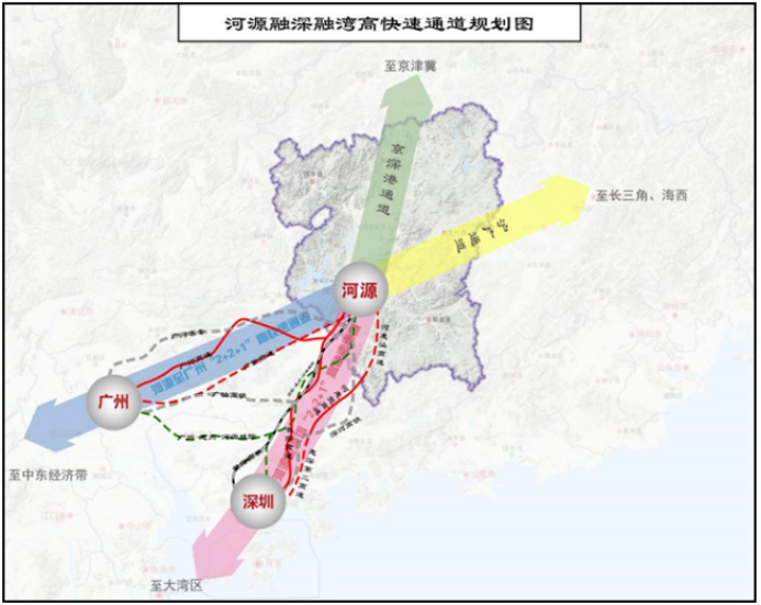 河源到深圳的贛深、深河2條高鐵通道,長深、河惠汕-廣龍-惠深2條高速公路通道,深圳-惠州-河源1條城際軌道