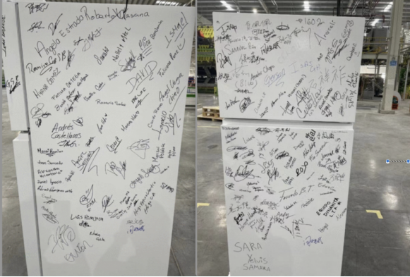 大家看到的這張照片,是今年8月19日,海信遠在墨西哥的蒙特雷家電產業園下線的第一臺冰箱,這上面密密麻麻簽下了200多個由漢語、英語、西班牙語和韓語簽名,這些簽名來自于把原本一片荒涼的土地建設成占地達380畝的現代化制造工廠的建設者以及合作伙伴們,一個又一個的簽名代表著他們對產品質量的確認、對消費者的承諾。蒙特雷工廠是海信全球29家制造基地中的一個,也是最艱難的一個,一年多來,我的同事們克服疫情、水源短缺與惡劣環境的影響,最終在一片一無所有的沙土地上高效完成了新工廠建設。目前這個制造基地已經量產冰箱和烤爐產品,這將加速海信對北美和加勒比海地區市場的拓展。蒙特雷工廠的建設者,也讓我想起了2019年,為解決海信位于墨西哥蒂華納電視工廠的新項目施工試產,我的同事白劍鋒帶領團隊租住在工廠對面,確保24小時“隨叫隨到”,當地寫著24小時營業的便利店實際也只服務18個小時,而海信員工卻始終做到24小時隨時待命支持項目,這種極度的勤奮與敬業,就連工廠門衛都忍不住感嘆“中國人太crazy”。